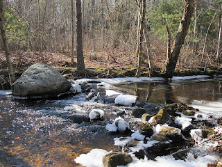 We have been enjoying the adventures prompted by a couple of books on local walks in Connecticut and Rhode Island that Sheri received from Santa. Today we ventured to Arcadia Wildlife Management Area in Exeter, RI and hiked the trail to Mount Tom. It was crisp (18F at 1pm), but sunny as we set off from the trail head at the Wood River just off of Rt 165. We have paddled from this same spot, so it was nice to come back to explore on foot. The trail is a rambling path that soon took us onto a ridge with fantastic views in all directions. At times we almost felt like we were in the Adirondacks or New Hampshire with rocky outcrops and clear views to distant "hills". It was a fine day, and we even found a warm spot near an old farm where we enjoyed hot soup for lunch in the brilliant sunshine.